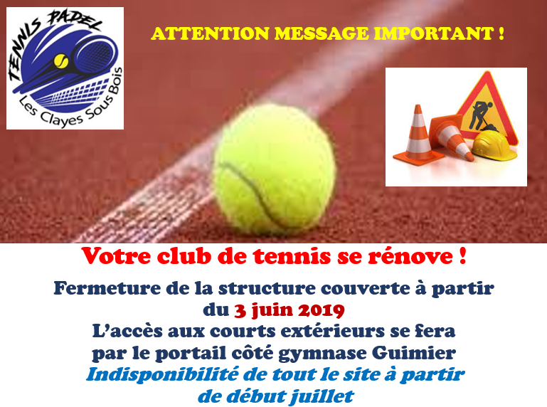 Ne connaissant pas avec précision les dates de fin de travaux, il est possible qu'en octobre les premiers cours collectifs de la saison prochaine ainsi que les competitions, soient délocalisés sur des courts extérieurs du TC de Plaisir et des courts couverts du comité des Yvelines à Feucherolles (nous vous informerons en temps voulu de l'évolution des travaux et des conditions de reprise de l'activité de la saison prochaine).